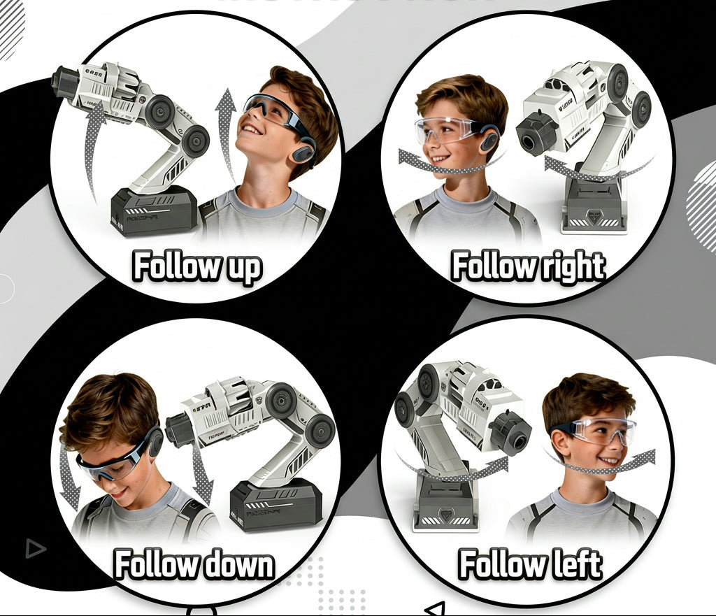 MotionBlaster uses motion-tracking sensors to automatically aim wherever you turn your head. Simply look toward your target and the turret rotates to match your movement, creating a fully immersive targeting experience.
